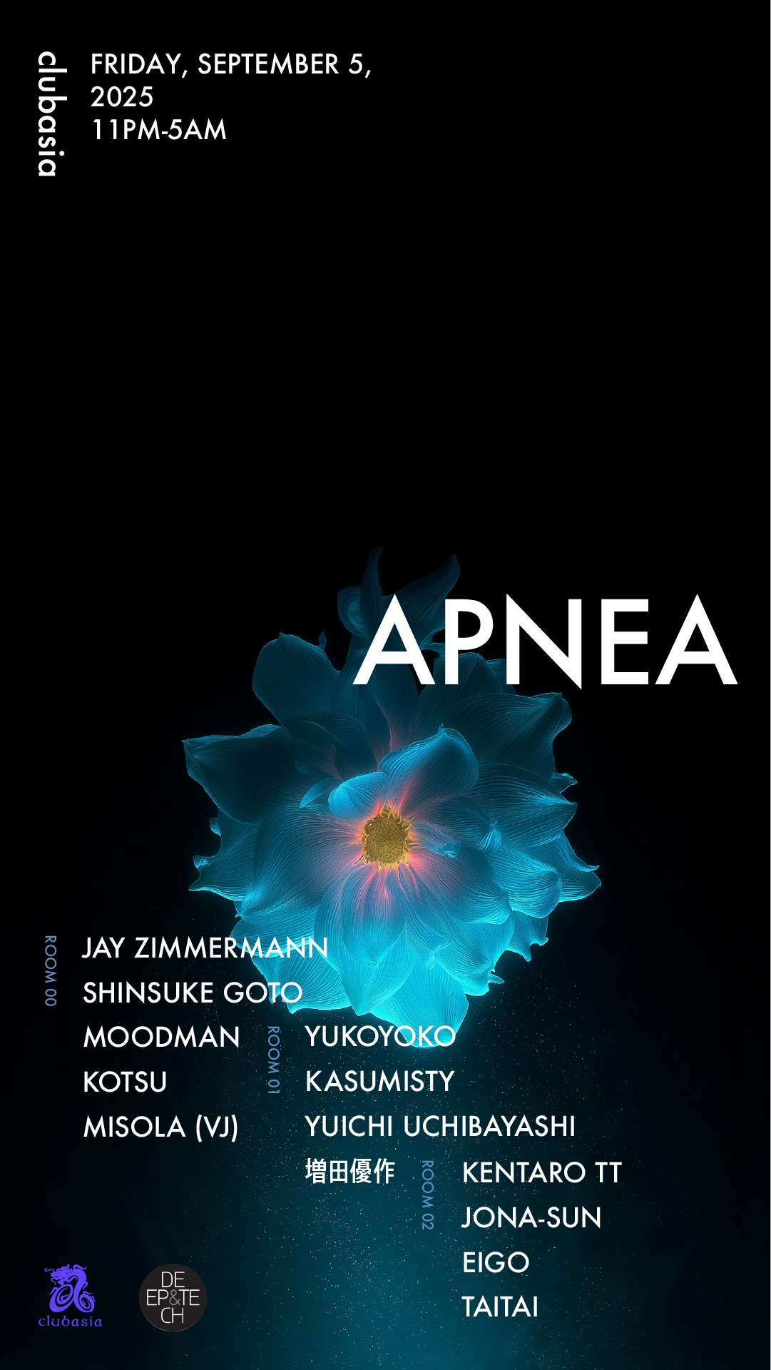 深く潜行するサウンドと、研ぎ澄まされたグルーヴが交錯する一夜。 9月5日(金)、渋谷 clubasia にて開催される「APNEA」は、ディープ・ハウス/ディープ・テクノを軸に、装飾を排した本質的なサウンドが鳴り響く一夜。シーンの最前線で活躍するDJたちが3フロアにわたり集結し、クラブの深層へと誘う。余計な飾りや煽りは存在しない。あるのは、フロアを揺らす音と、意識を覚醒させるグルーヴだけ。 ROOM 00(メインフロア)