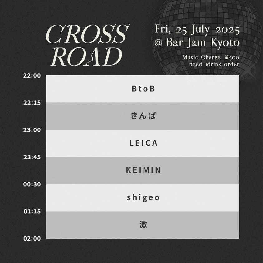 京都木屋町Bar Jamにて開催される、House~Bass MusicまでのハイスピードミュージックパーテイCROSS ROAD、今回は大阪京都を中心に大活躍のTechno DJのKEIMINと、以前も出演してもらった滋賀よりshigeoのScrambleの2人をお呼びしての会です。2人とも若いのに素晴らしいDJです👏