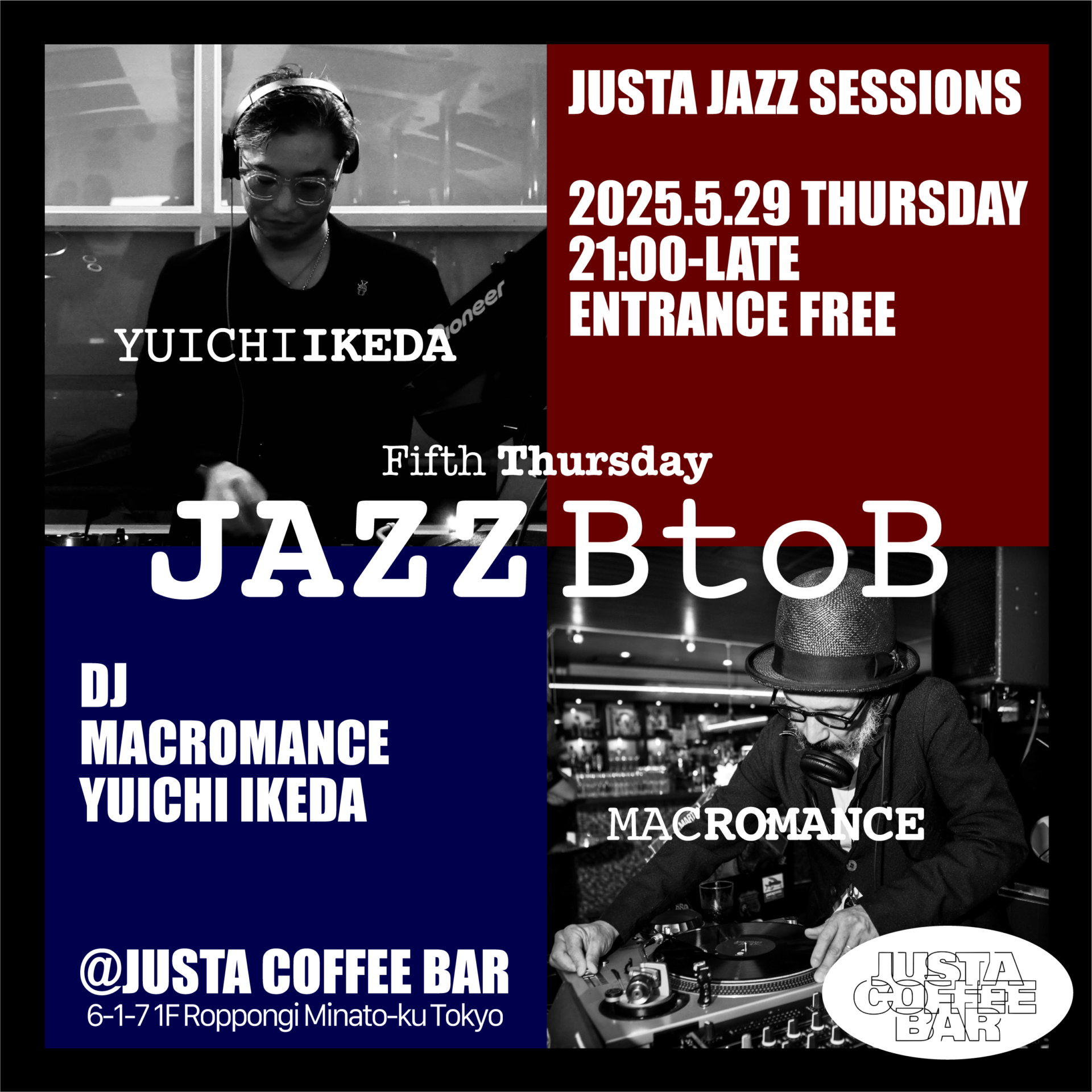 2025年に4日しかない第5木曜日。どこかミステリアスな月末の木曜はJAZZ BtoB Sessions。マックロマンスと選曲家&音空間家の池田雄一さんの2人でJUSTAをJAZZ色に染め上げます。異なるバックグラウンドを持ちながら共にJAZZを愛するふたりのDJの衝突、融合、新たな化学反応をお楽しみください。