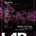 3月のL4Bは、国内外のフロアを体感し、今も新宿・大阪・名古屋など各地の現場を飛び回るDJ Kyoroと、名古屋から独自のハウス沼を提唱し続けるTosh K.をゲストに迎えて開催します!