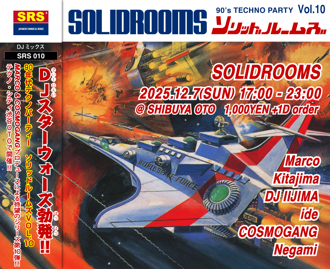 Event Information 出演者 Marco Kitajima DJ IIJIMA ide COSMOGANG Negami 開催場所 OTO(会場URL ) 東京都渋谷区渋谷 3丁目 18 - 7 東一号館ビル 5F 開催日程 START : 2025.12.07 17:00 / END : 2025.12.07 23:00 Googleカレンダーに追加 料金 ¥1000 + 1D order 年内を締めくくるSOLIDROOMS vol.10!渋谷OTOで開催!!90年代テクノを大特集!!! 90's90sacidElectrominimalTechno