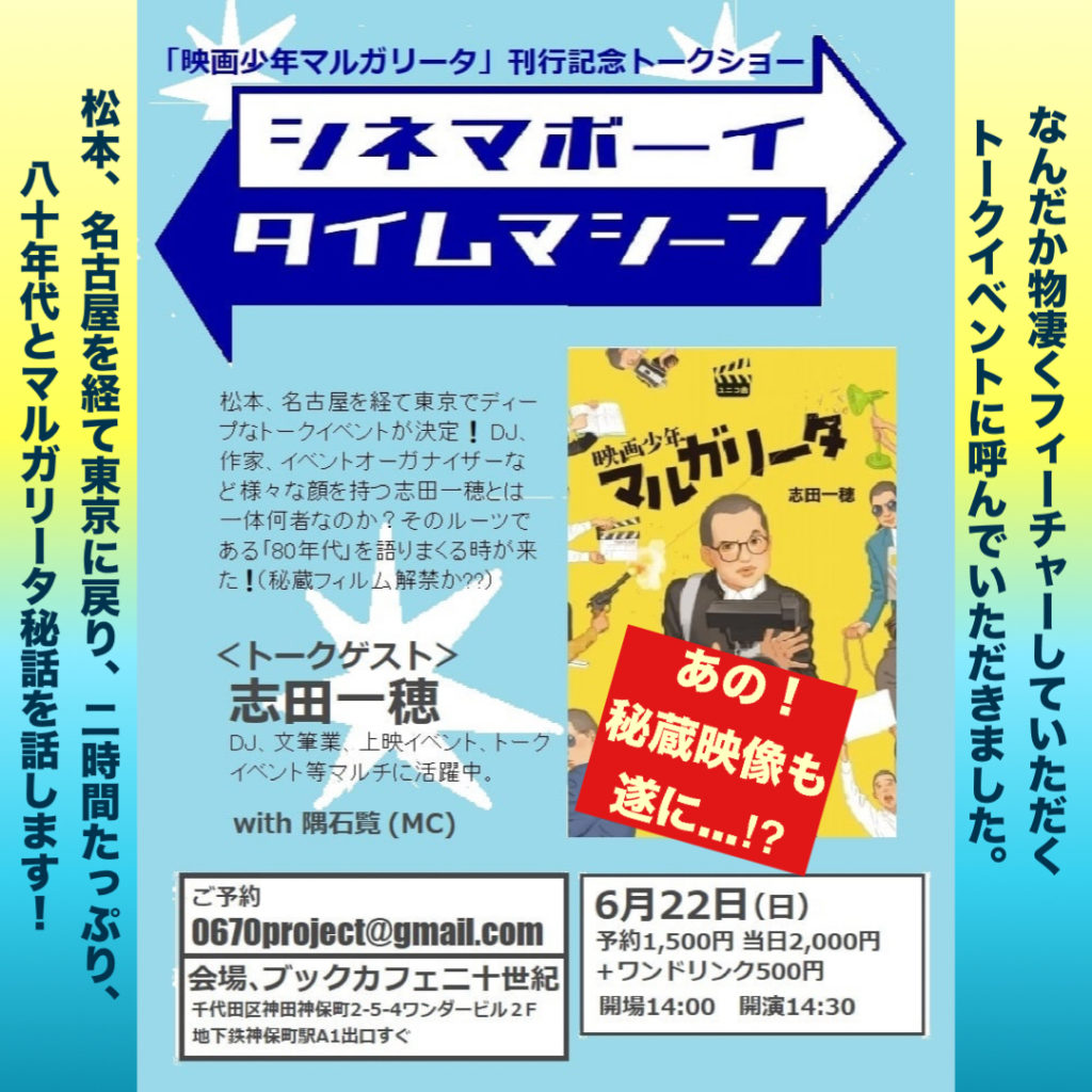 レアとおぼしきサントラを勝手気ままに紹介していく『このサントラ、ちょっとレア。』 新作小説『映画少年マルガリータ』行商ツアーin松本&名古屋に行ってきましてあさっての日曜は東京に戻って神保町の二十世紀カフェでまたまたマルガリータトークイベントをやらかす志田一穂がご案内します。