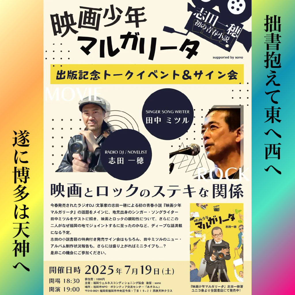 というわけで今回は壮大なプロモーション・コラムになってしまいましたが、それでもいつもよりレアネタをガシガシ展開させてはいただきましたので何卒ご容赦いただきければ。そして是非明日は福岡は天神のトークショー会場へ遊びにいらしていただけると嬉しいです。志田の拙書「映画少年マルガリータ」の販売もありますし、ミツルさんの現在製作中、新作アルバムの話も聞けると思います。まだ間に合うお申込みはこちら。映画とロックのステキな関係 トークイベント 出演 志田一穂 田中ミツル