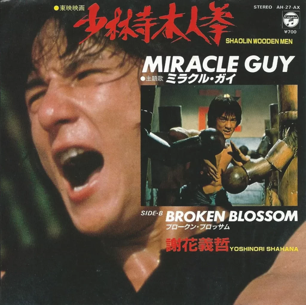 まず『少林寺木人拳』ですね。劇中流れる歌が、まさかの“日本語歌詞”なのです。いやいやいや、これ香港映画なんでしょ?と。しかも日本の公開はジャッキー人気にあやかって1981年だけど、実際の製作年は1976年じゃないのと。なんでそんな時代に日本語歌詞のテーマ曲がこの映画に流れているのよと。タイトルの「ミラクル・ガイ」もなんだか香港映画らしからぬタイトルで怪しさMAXだし、歌っているのは謝花義哲という日本の方。なんで?なんで??と、パンフレットを買ってみると、そこに書いてあることを読んでびっくり。この歌、作曲が林哲司じゃん! 林さんと言えばあなた、杉山清貴とオメガトライブでしょ!菊池桃子でしょ!もっと言えば今になって世界中で大ブレイクしているシティポップ「真夜中のドア~Stay With Me」(1979)でしょ!と。