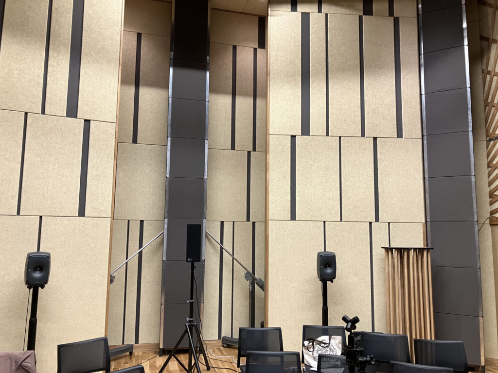 会場の奥行にはヘキサゴン状の空間にスピーカーが張り巡らされ、壁面は精密に吸音できるような木版が、小学校の音楽室によくあるようなそれよりもはるかに計り知れないような精密さと計算によって張り巡らされているように感じられる機構と空間に包まれる。天井も小さな聖堂のように高めに感じた。