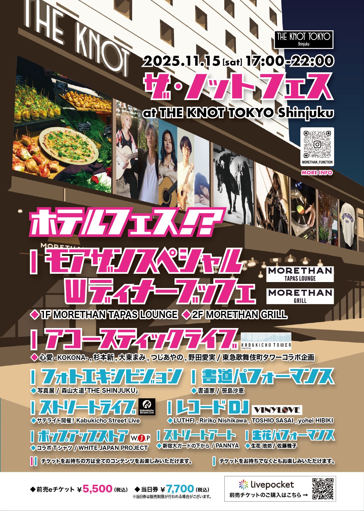 西新宿 都庁裏に佇むTHE KNOT TOKYO Shinjuku。落ち着いたロケーションとスタイリッシュな内観、1F /2Fのレストラン「MORETHAN」による食の提案にて多くの方に足を運んで頂いているライフスタイルホテルです。THE KNOT FESは今回、記念すべき第1回目の実施となり、主に『新宿』をテーマにした様々なコンテンツを通じて『ホテルを遊ぼう!』を表現します!